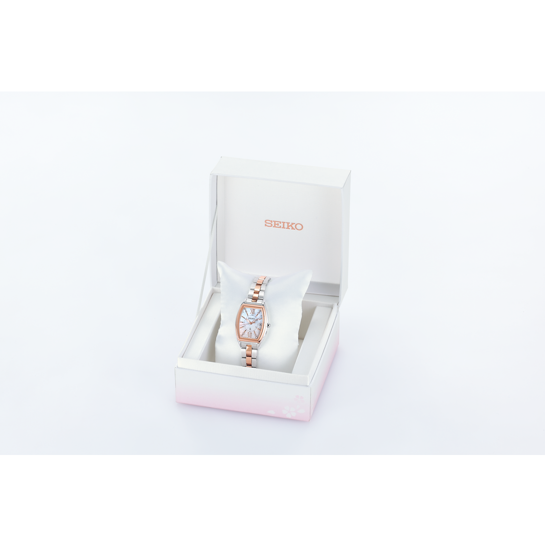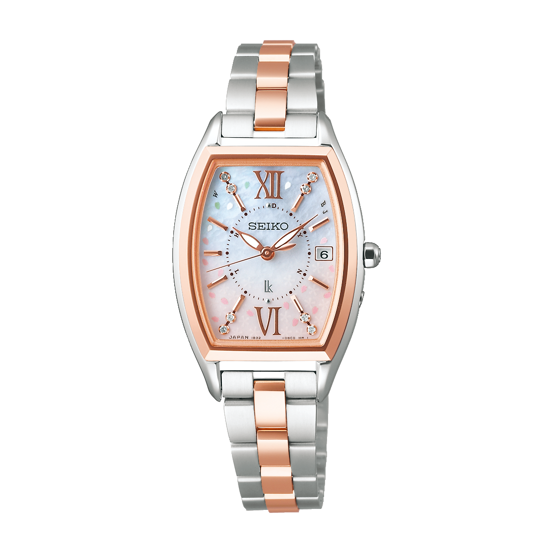 ピンクのグラデーションカラーが施された白蝶貝ダイヤルに、新生活を応援してくれるような満開の桜が描かれています