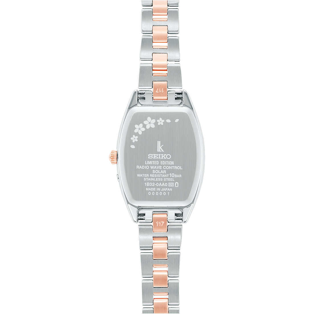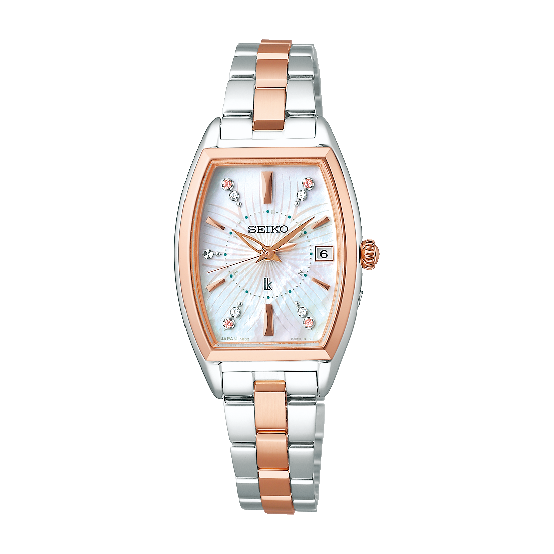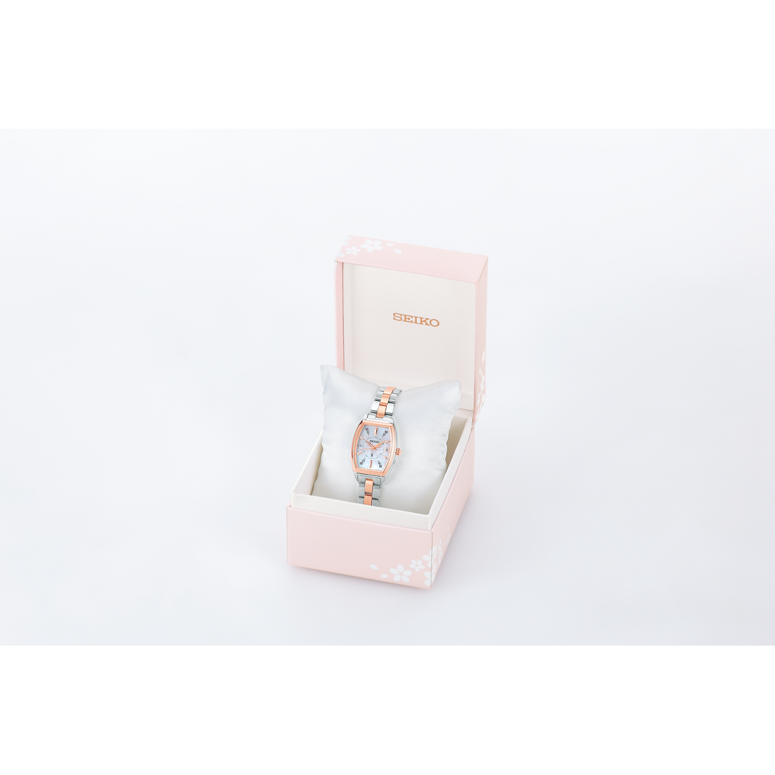 トノー型のSSVW226は、花びらが開く様をイメージした繊細で伸びやかな桜のモチーフを、白蝶貝のダイヤルにデザイン。